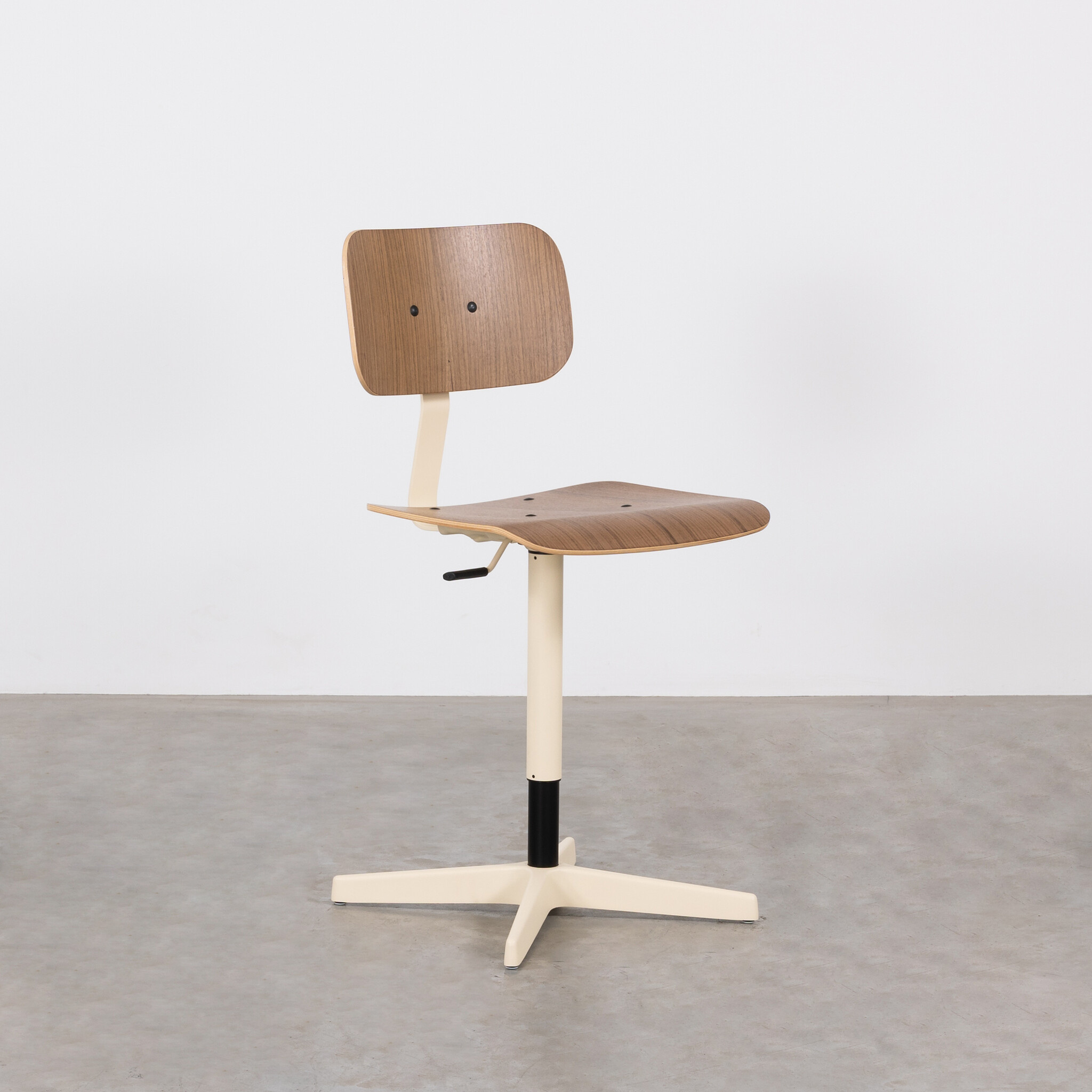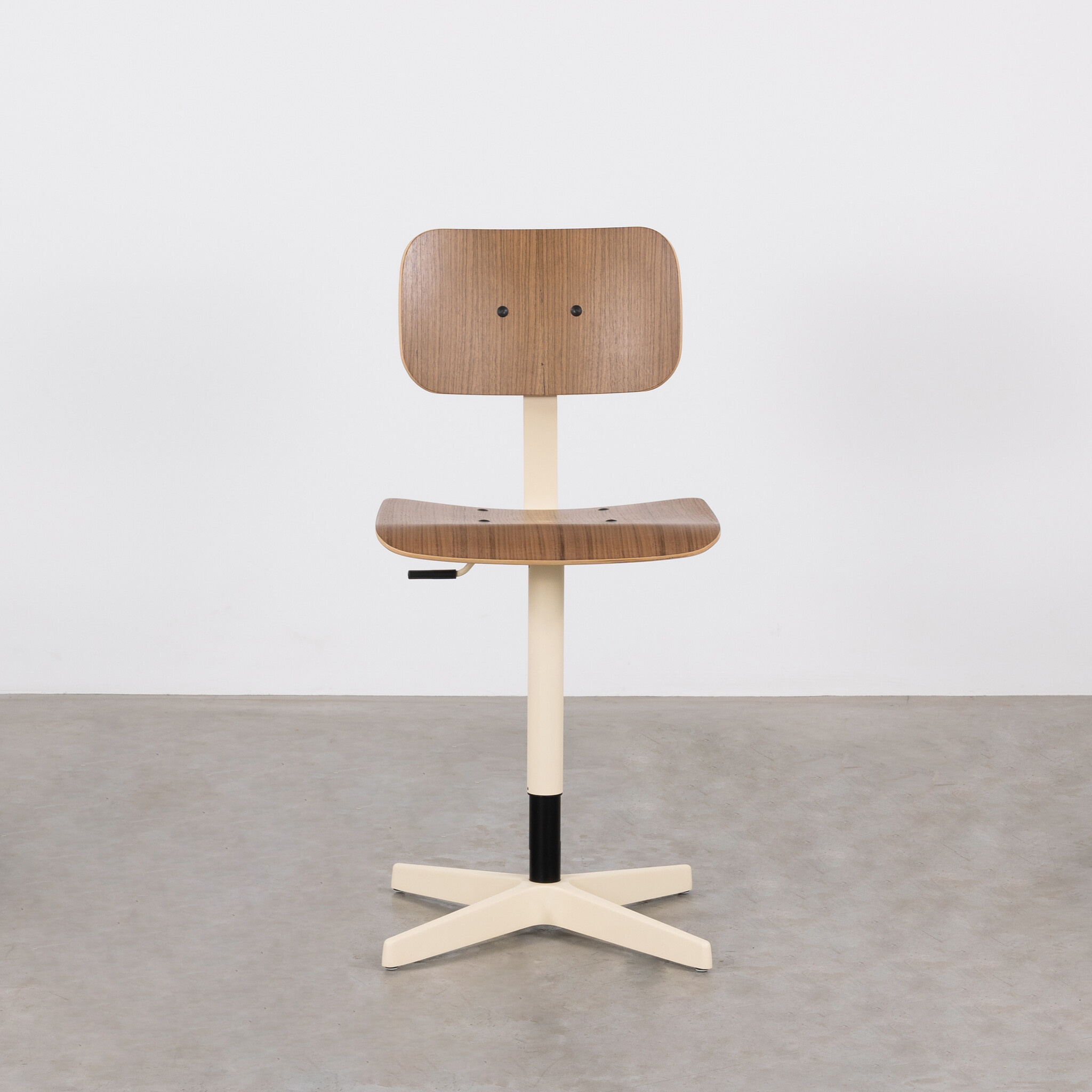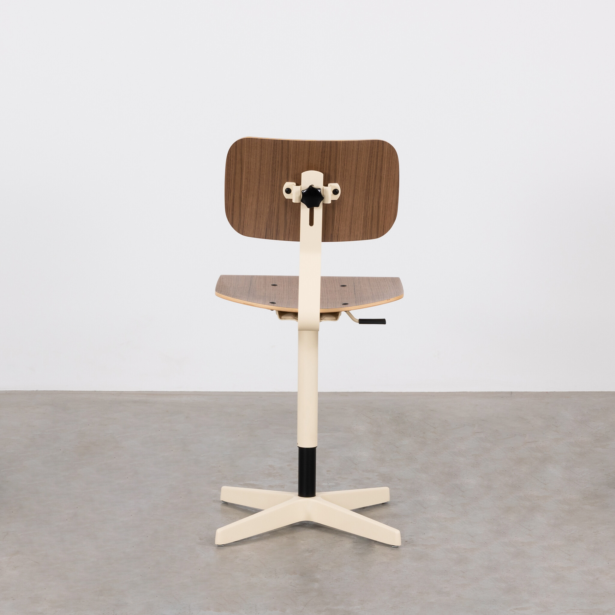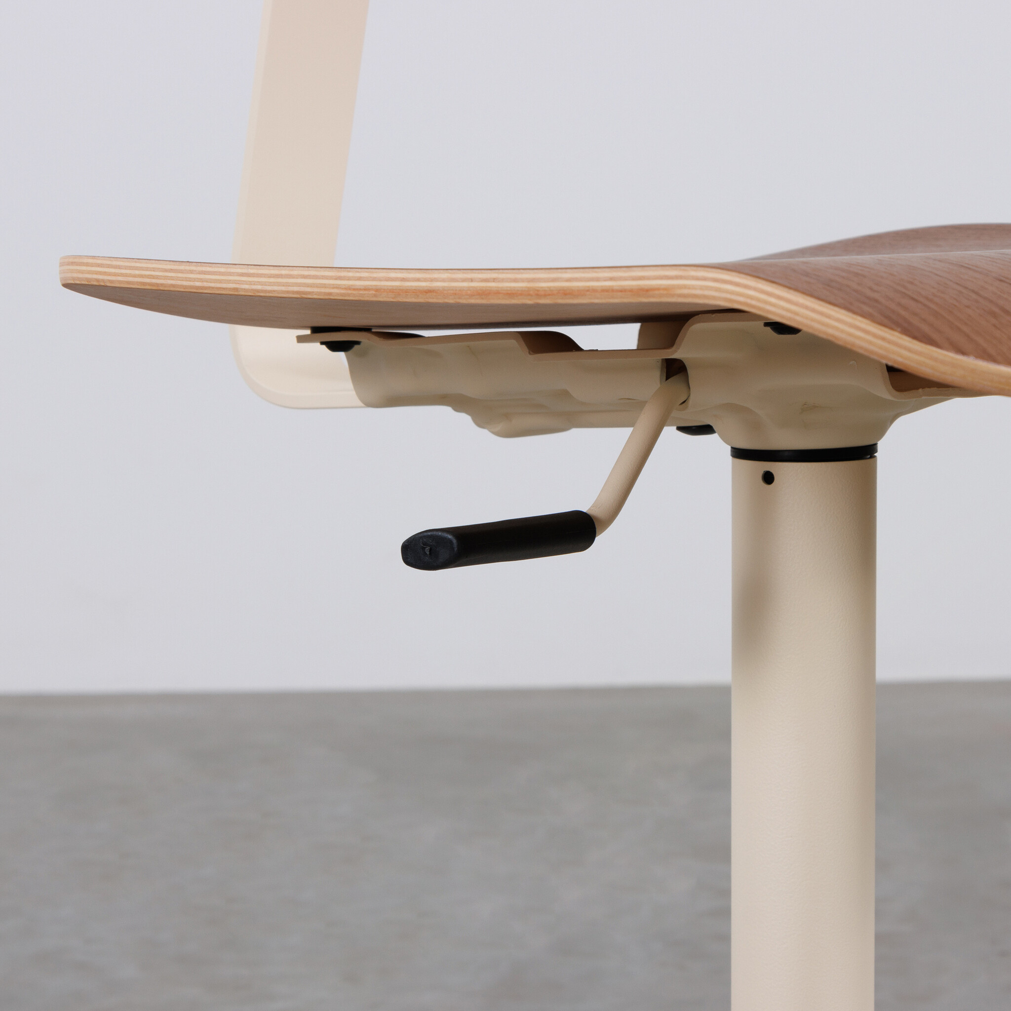 Niet te missen is het frame, dat beschikbaar is in 5 verschillende gepoedercoate kleuren. Of je nu kiest voor een grafietzwarte afwerking, bruinbeige, muisgrijs, grijsbeige of een lichtivoor, deze werkstoel past naadloos bij elke stijl en smaak. De zitting en rugleuning zijn mogelijk in een fineer van eikenhout of walnotenhout.