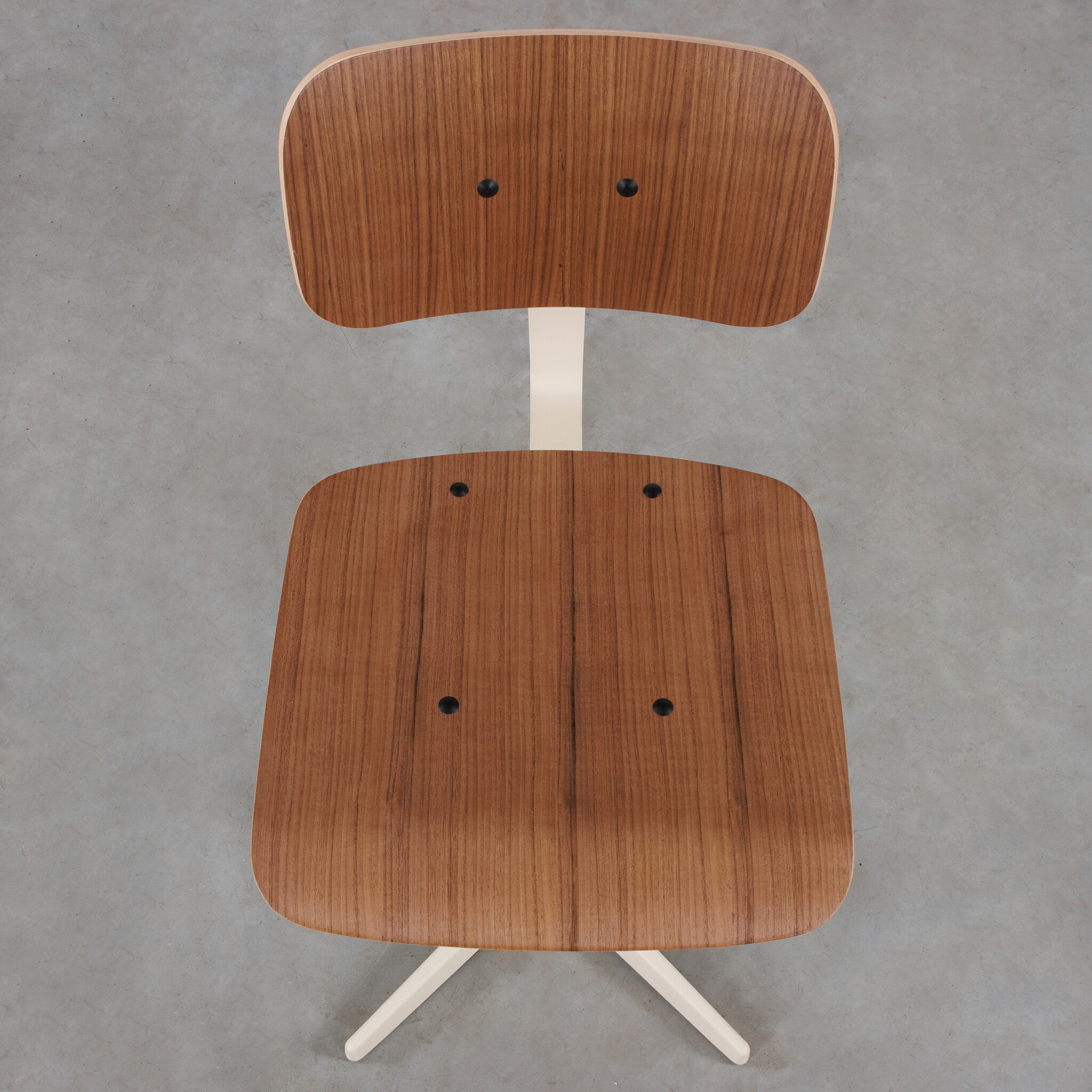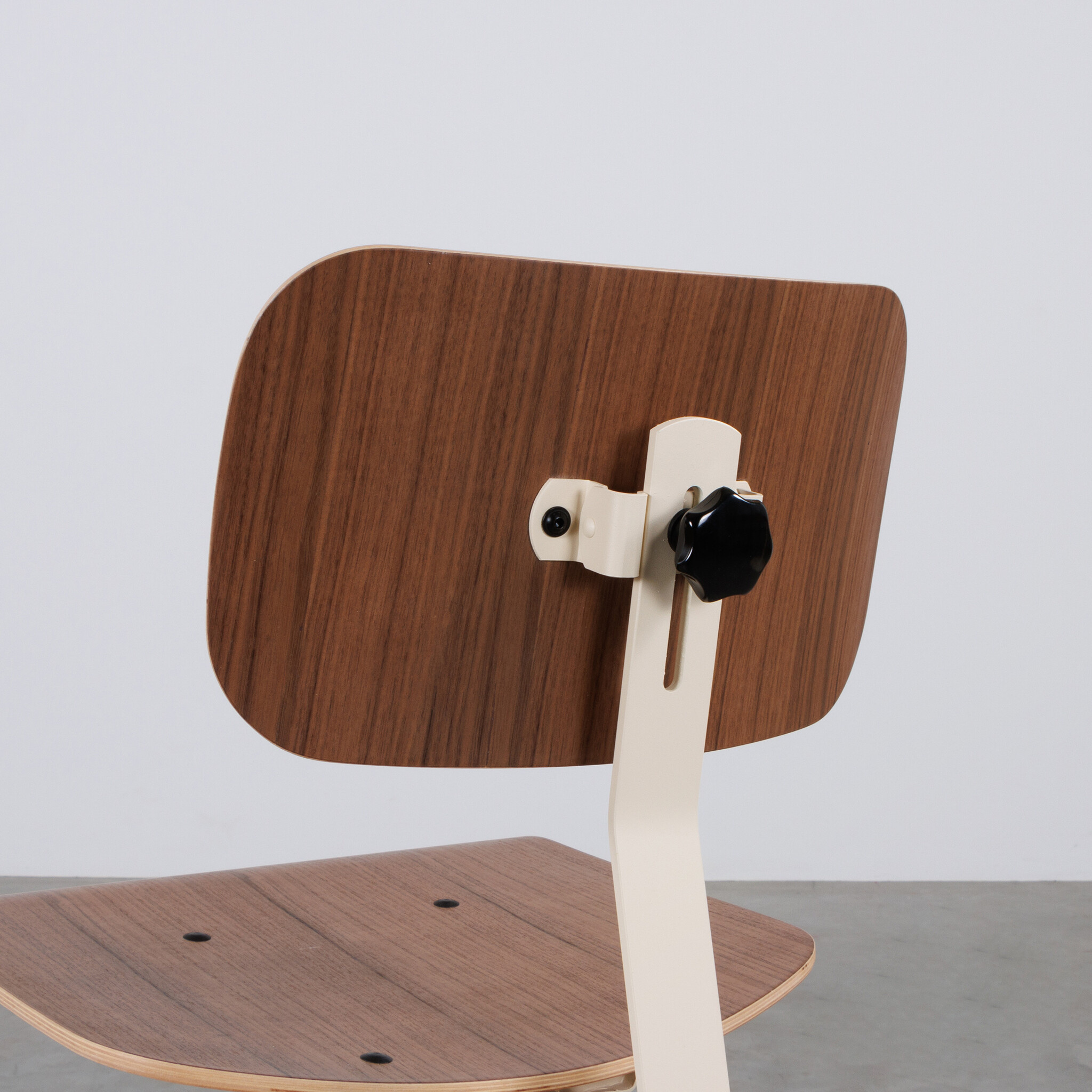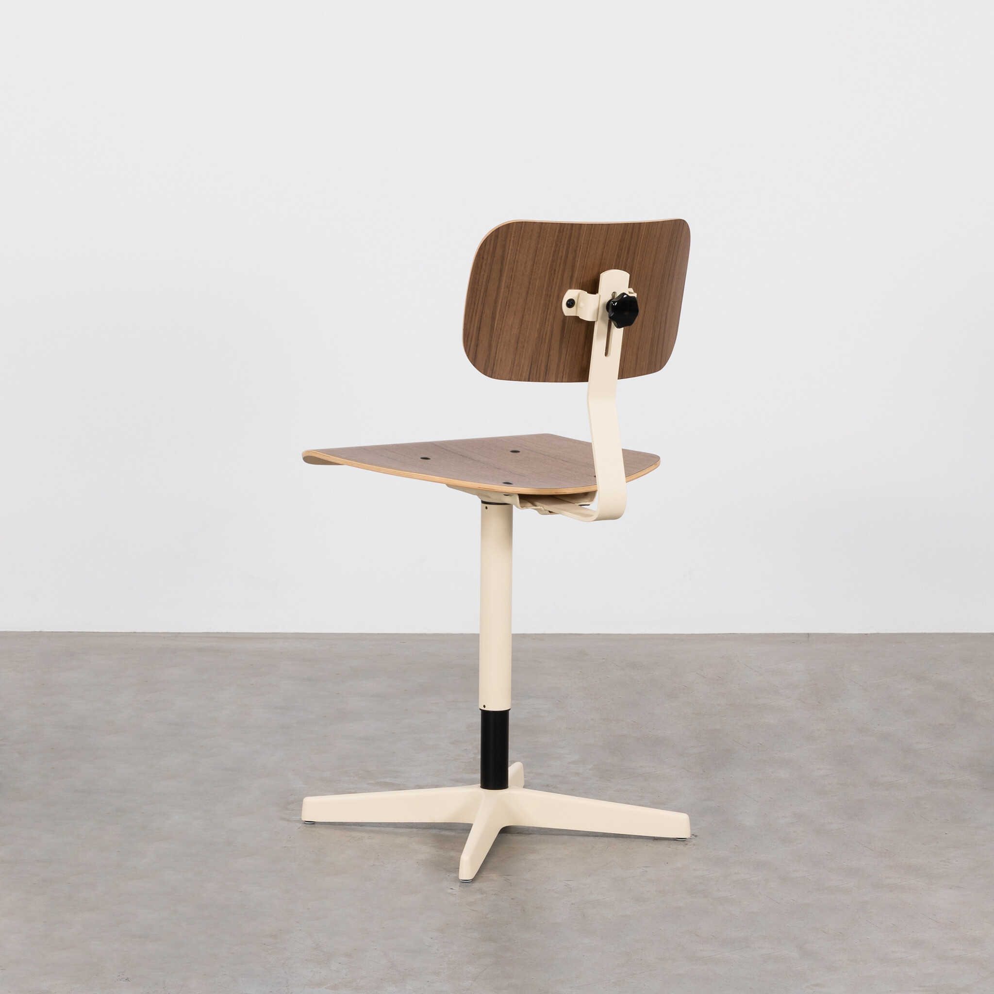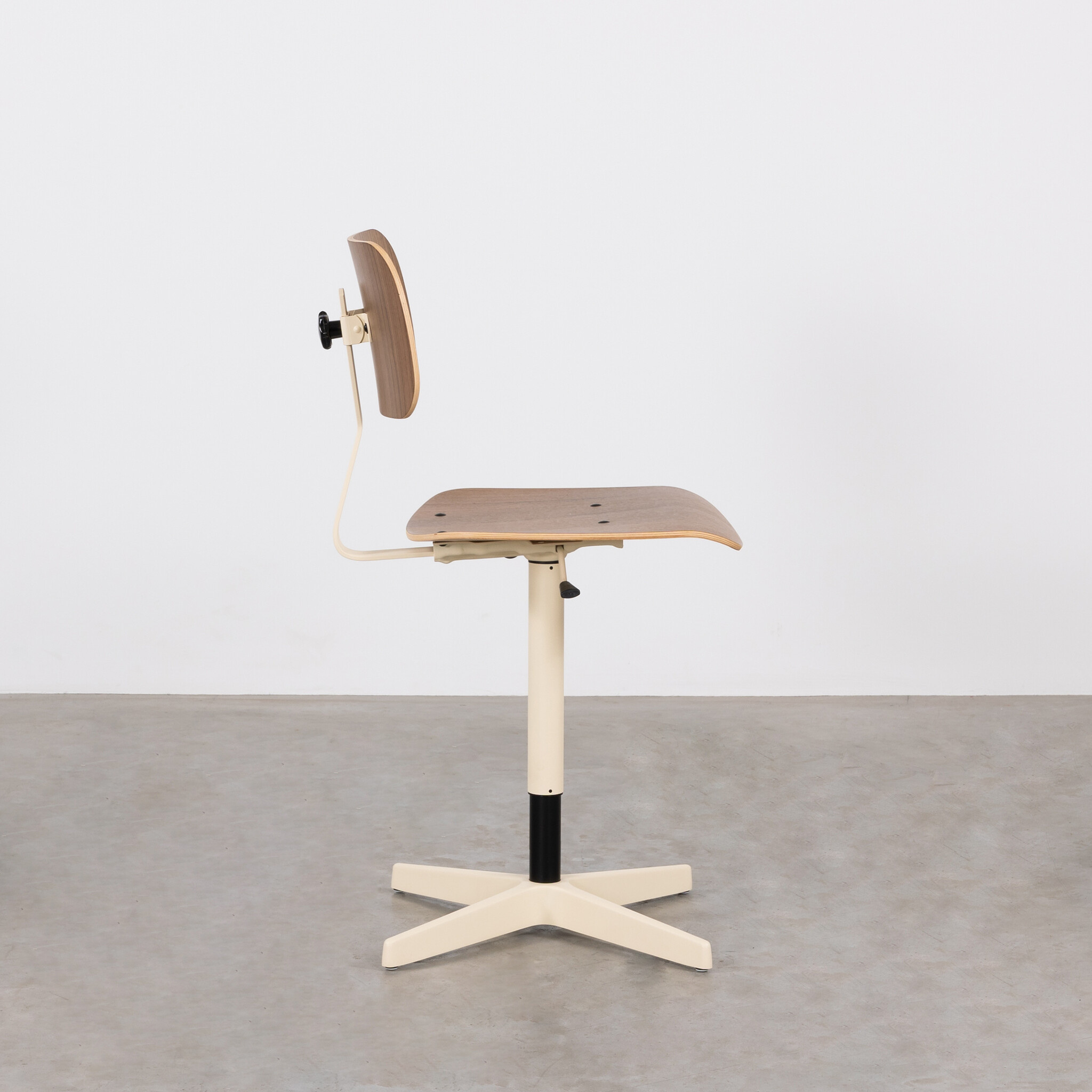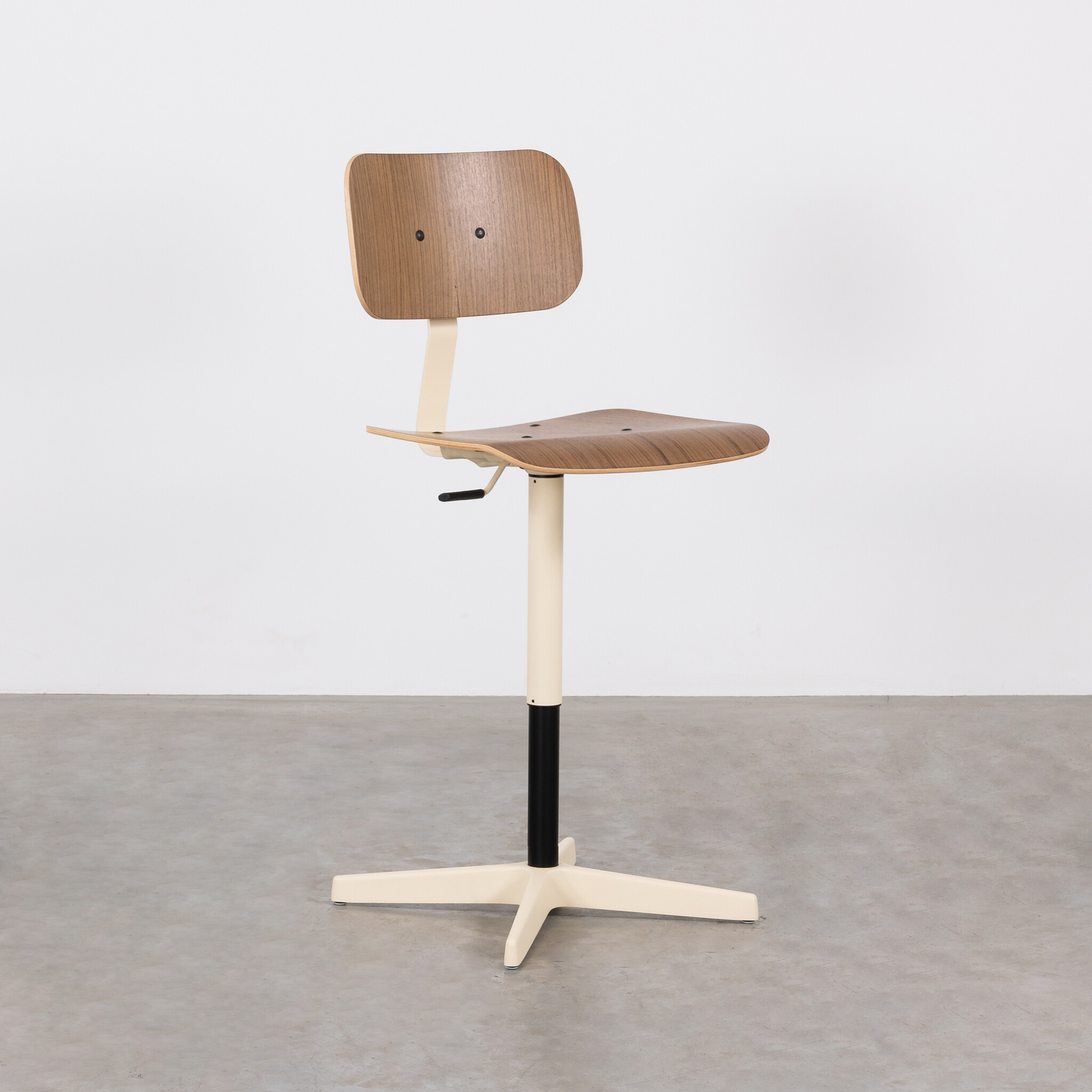 Niet te missen is het frame, dat beschikbaar is in 5 verschillende gepoedercoate kleuren. Of je nu kiest voor een grafietzwarte afwerking, bruinbeige, muisgrijs, grijsbeige of een lichtivoor, deze werkstoel past naadloos bij elke stijl en smaak. De zitting en rugleuning zijn mogelijk in een fineer van eikenhout of walnotenhout.