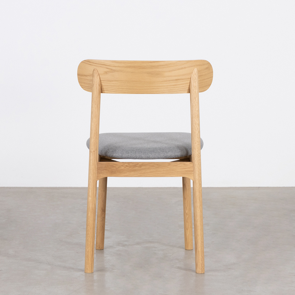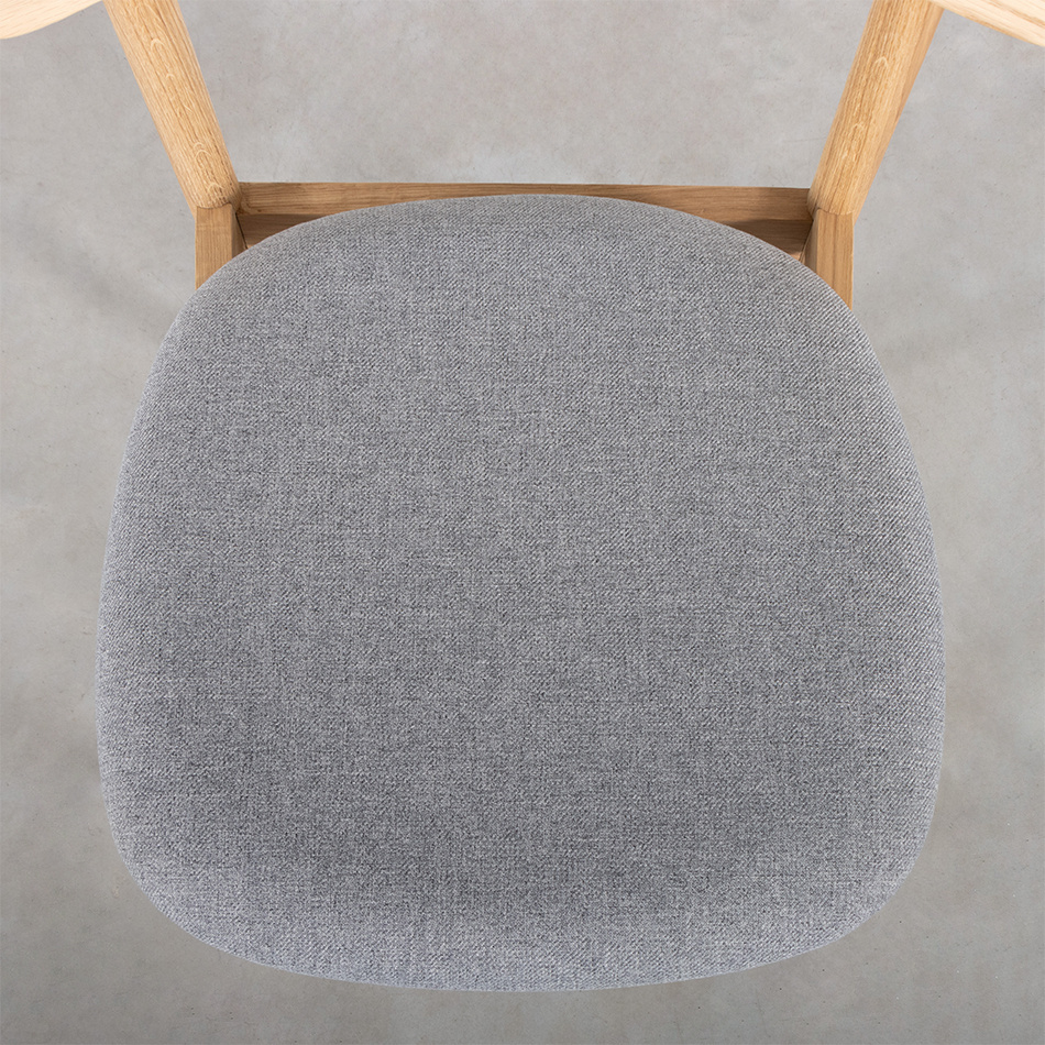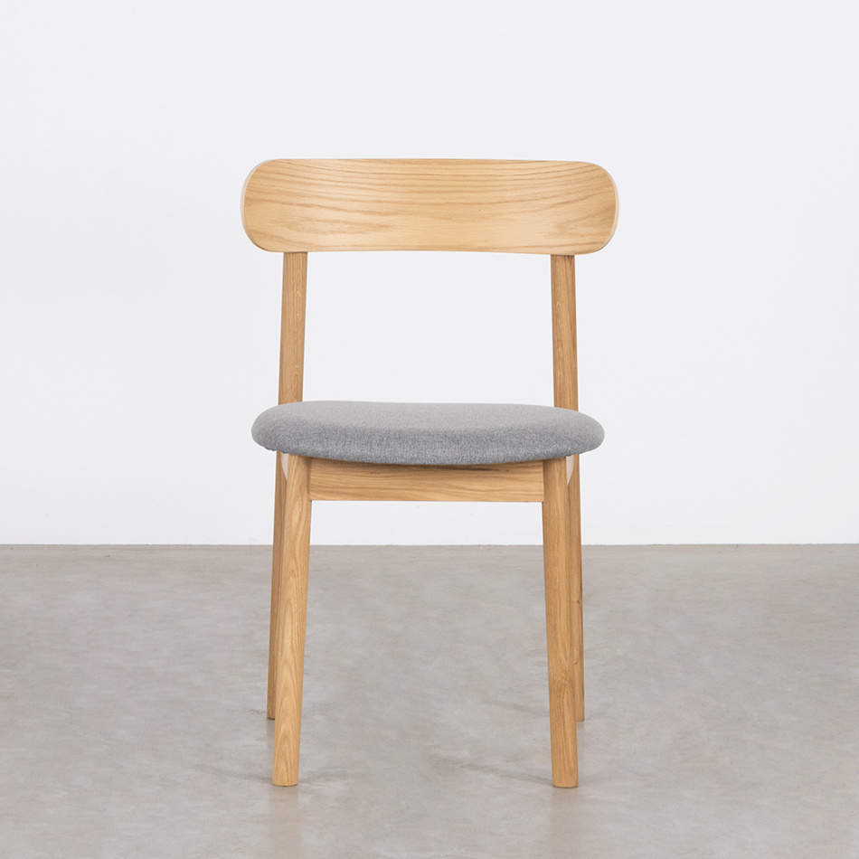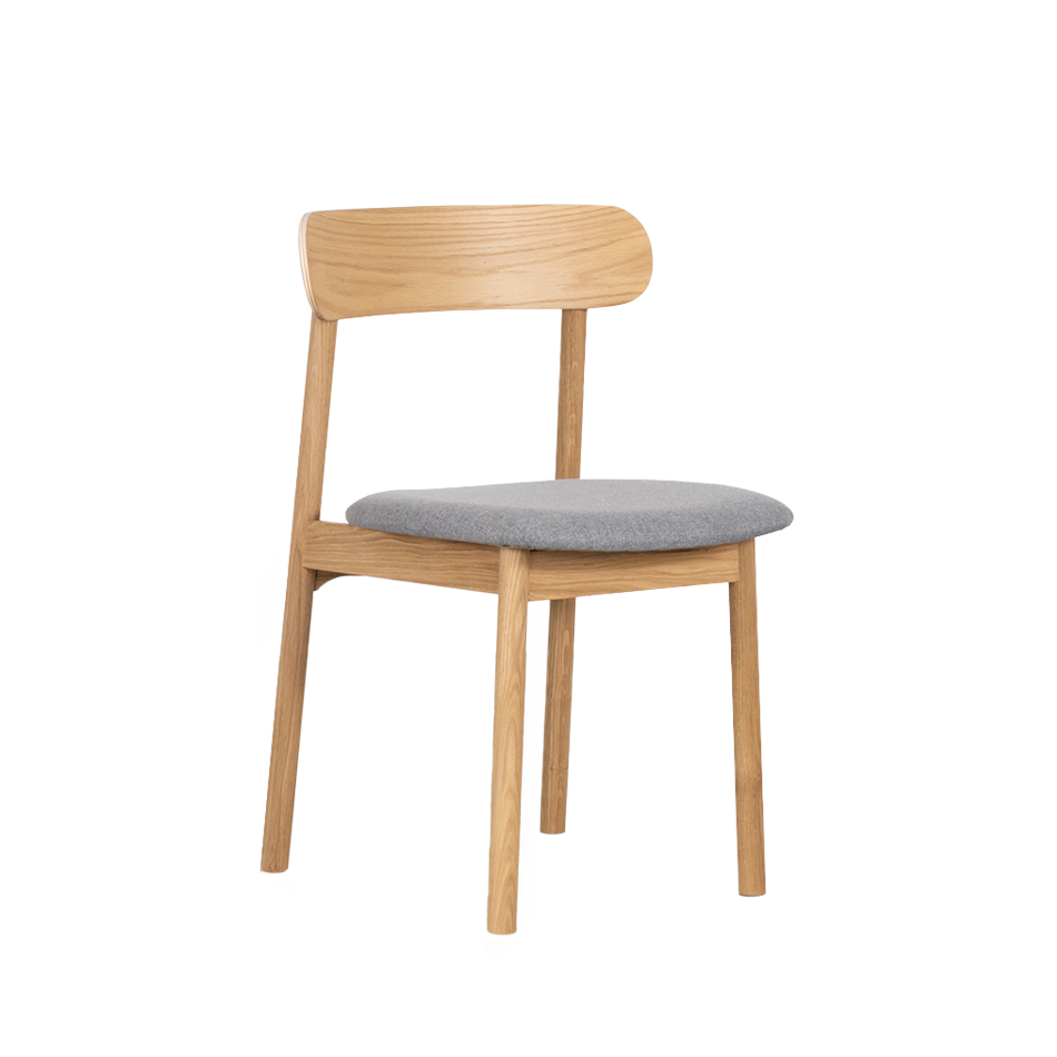 Het eikenhout wordt standaard afgewerkt met olie. De gestoffeerde zitting en rugleuning zijn leverbaar in verschillende stofsoorten en kleuren.
