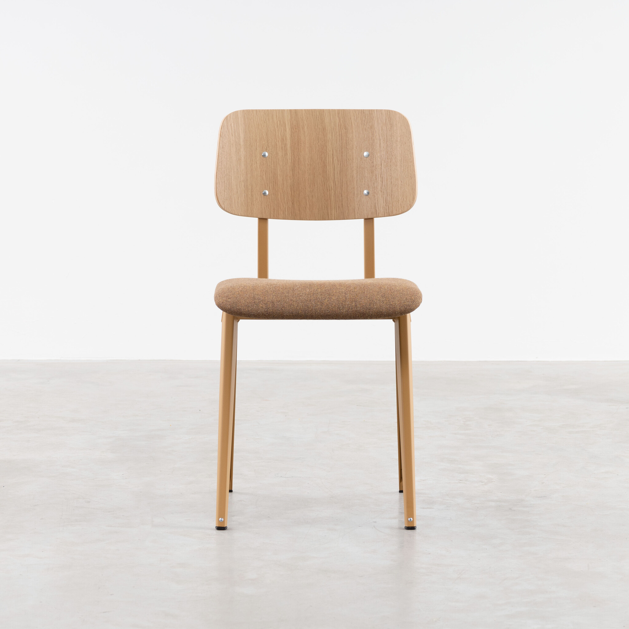 Materiaal: frame gemaakt van gevouwen plaatstaal. Zitting gestoffeerd. Rugleuning gemaakt van gelakt eiken fineer.