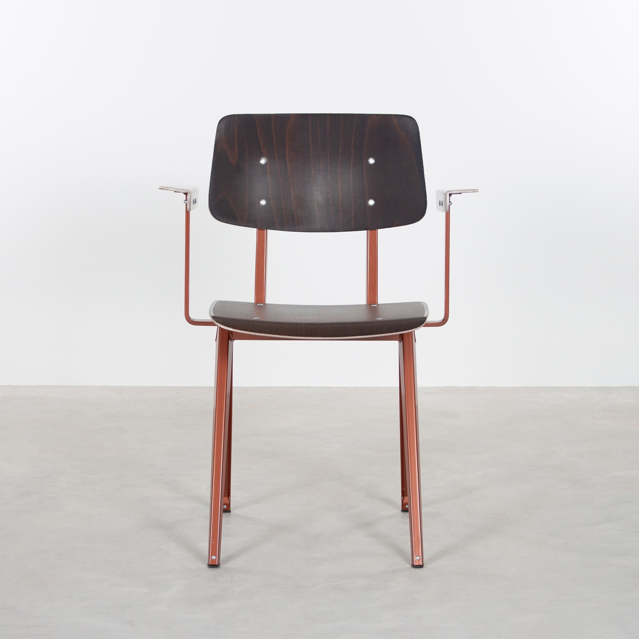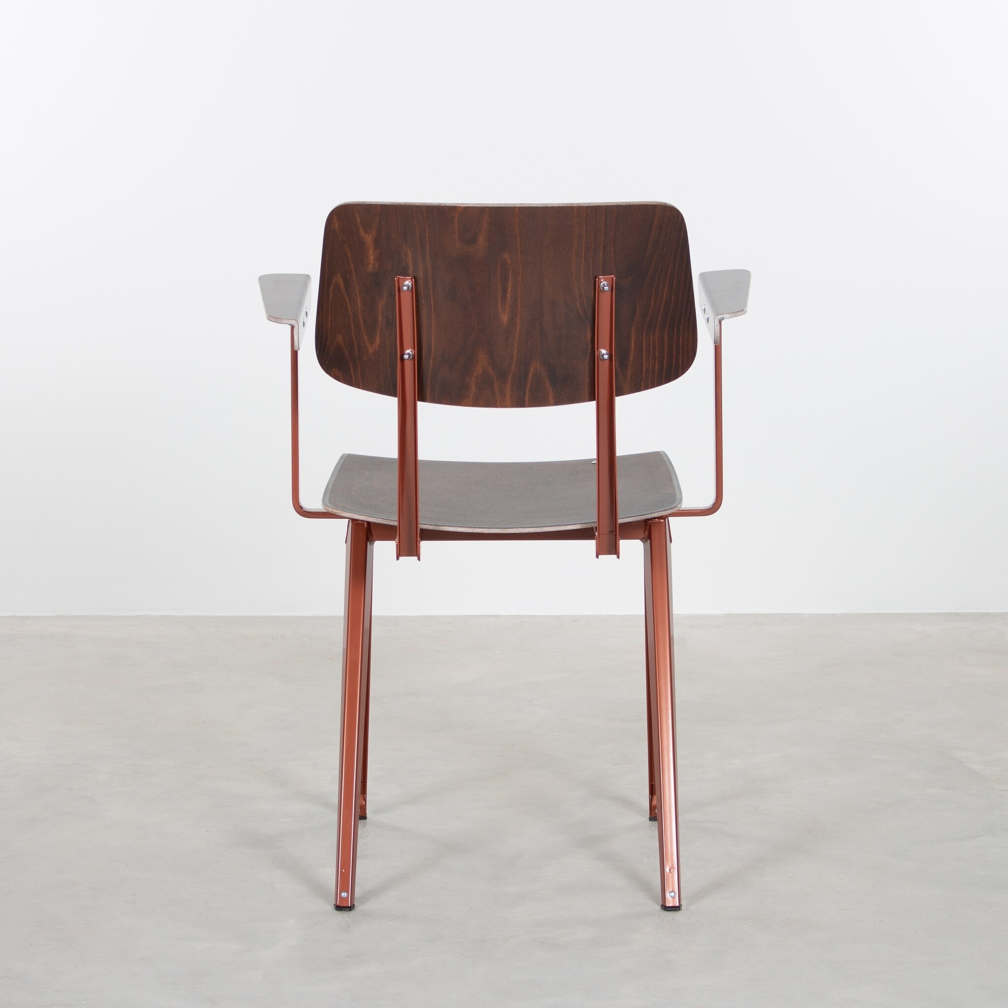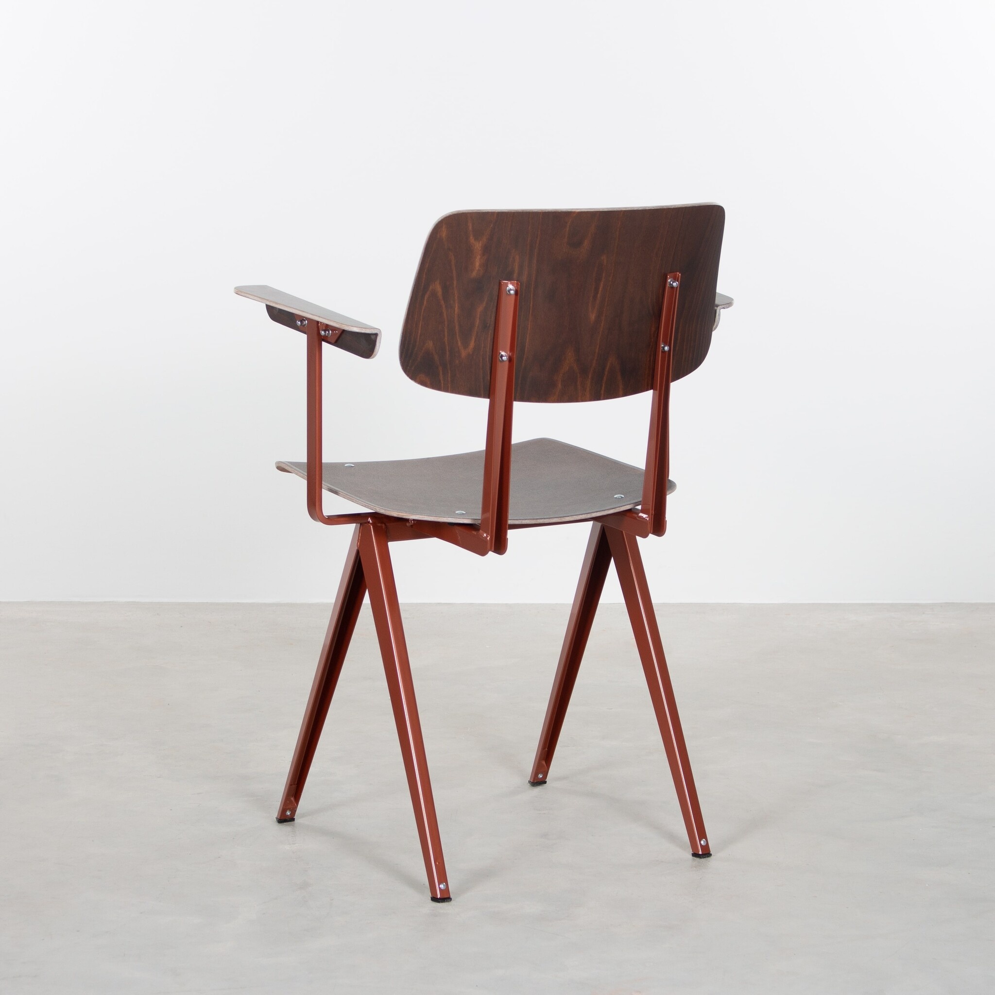 Deze unieke stoel werd eind jaren ’50, begin jaren ’60 ontworpen en geproduceerd door Galvanitas in Oosterhout. In plaats van de gebruikelijke buisconstructie, koos de ontwerper voor een frame van geperst plaatstaal, wat zorgde voor een revolutionair en solide design. De stoel is speciaal ontworpen voor intensief gebruik in openbare gebouwen zoals scholen, instellingen en kantines, waardoor zijn unieke karakter ook vandaag nog duidelijk herkenbaar is.