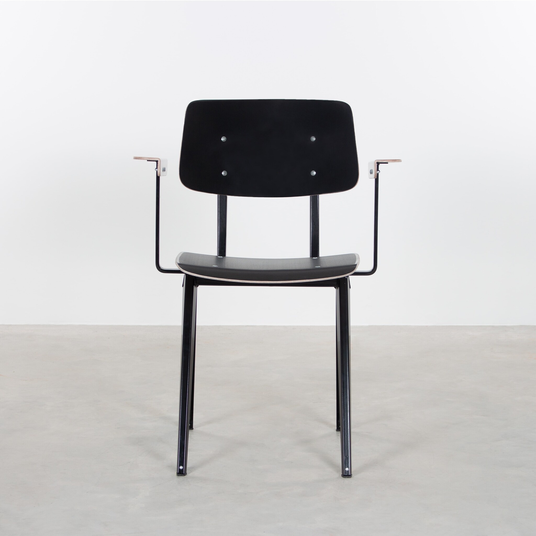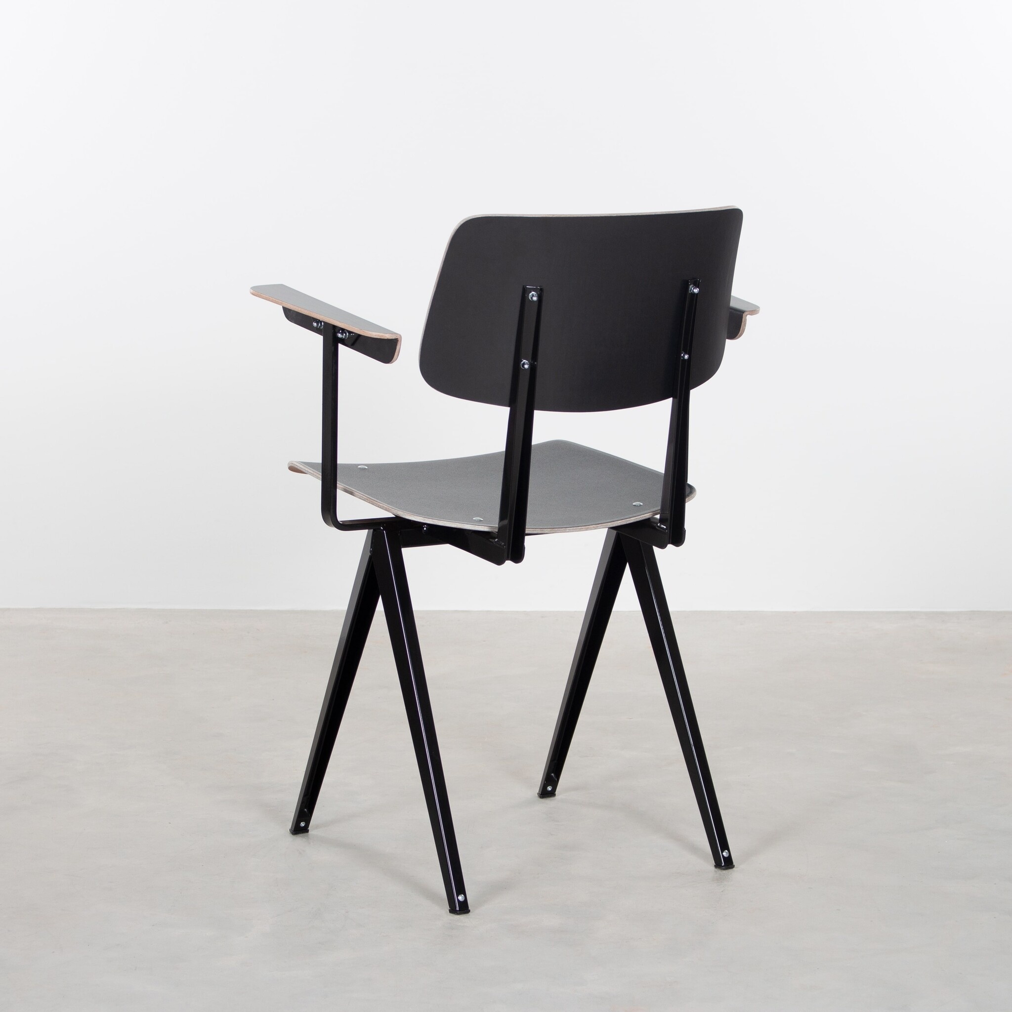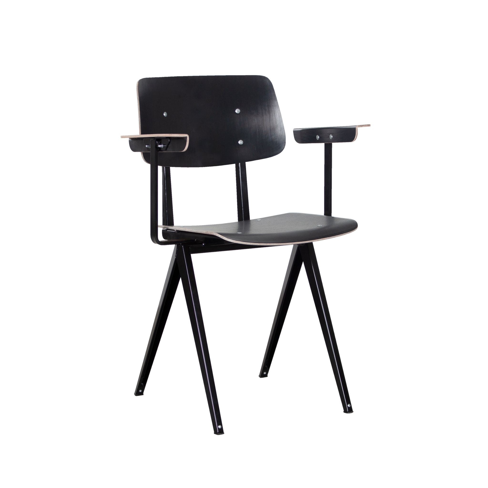 Deze unieke stoel werd eind jaren ’50, begin jaren ’60 ontworpen en geproduceerd door Galvanitas in Oosterhout. In plaats van de gebruikelijke buisconstructie, koos de ontwerper voor een frame van geperst plaatstaal, wat zorgde voor een revolutionair en solide design. De stoel is speciaal ontworpen voor intensief gebruik in openbare gebouwen zoals scholen, instellingen en kantines, waardoor zijn unieke karakter ook vandaag nog duidelijk herkenbaar is.