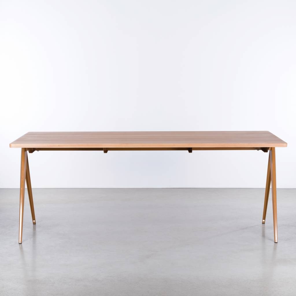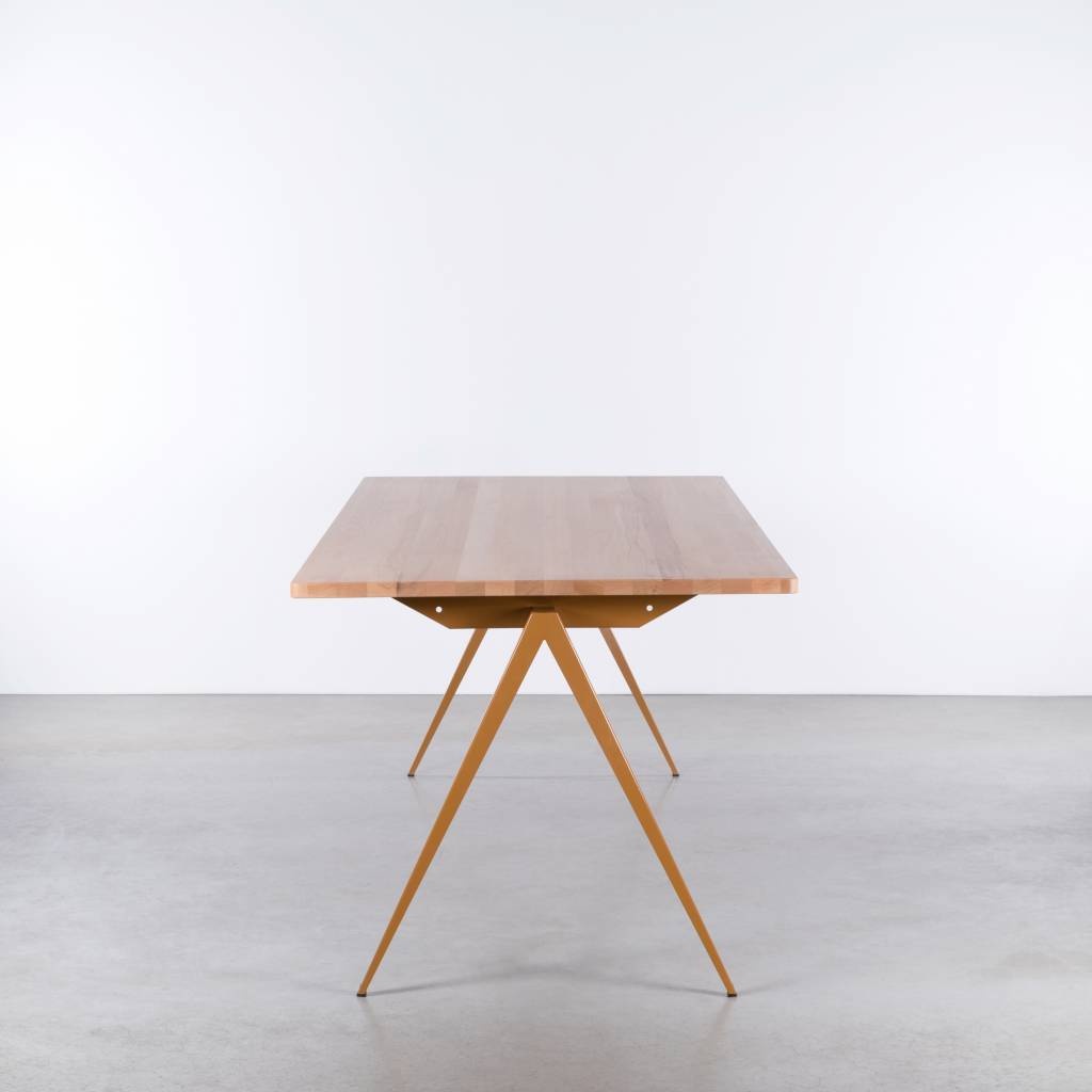 De TD4 tafel is een bijzonder ontwerp. Misschien komt het je bekend voor. De tafel is gebaseerd op de stalen schooltafeltjes uit de jaren ’60. Nu een eettafel met een metalen onderstel en een blad van massief hout. Constructief zijn alle elementen gelijk aan het stalen schooltafeltje. Ook het design met de strakke lijnen en karakteristieke passervormige poten zijn overgenomen. Het ontwerp ziet er ogenschijnlijk eenvoudig uit, maar het geoefend oog zal een tal van fraaie en kenmerkende elementen ontdekken. Voor onze gerenommeerde tafelmaker absoluut een uitdaging, maar het resultaat mag er zijn.